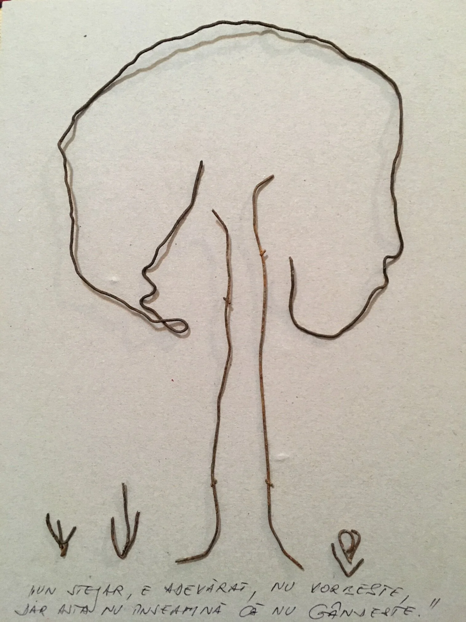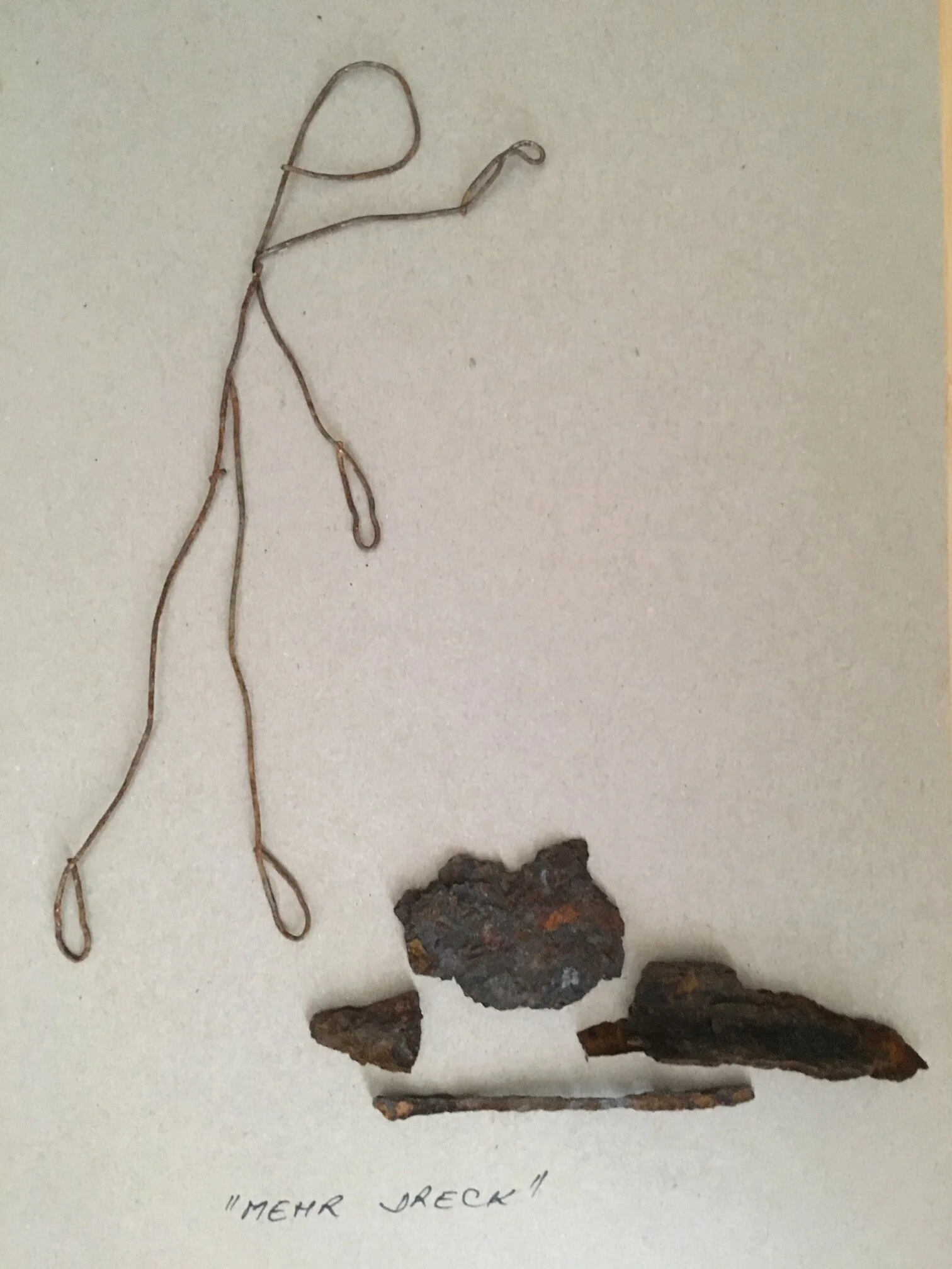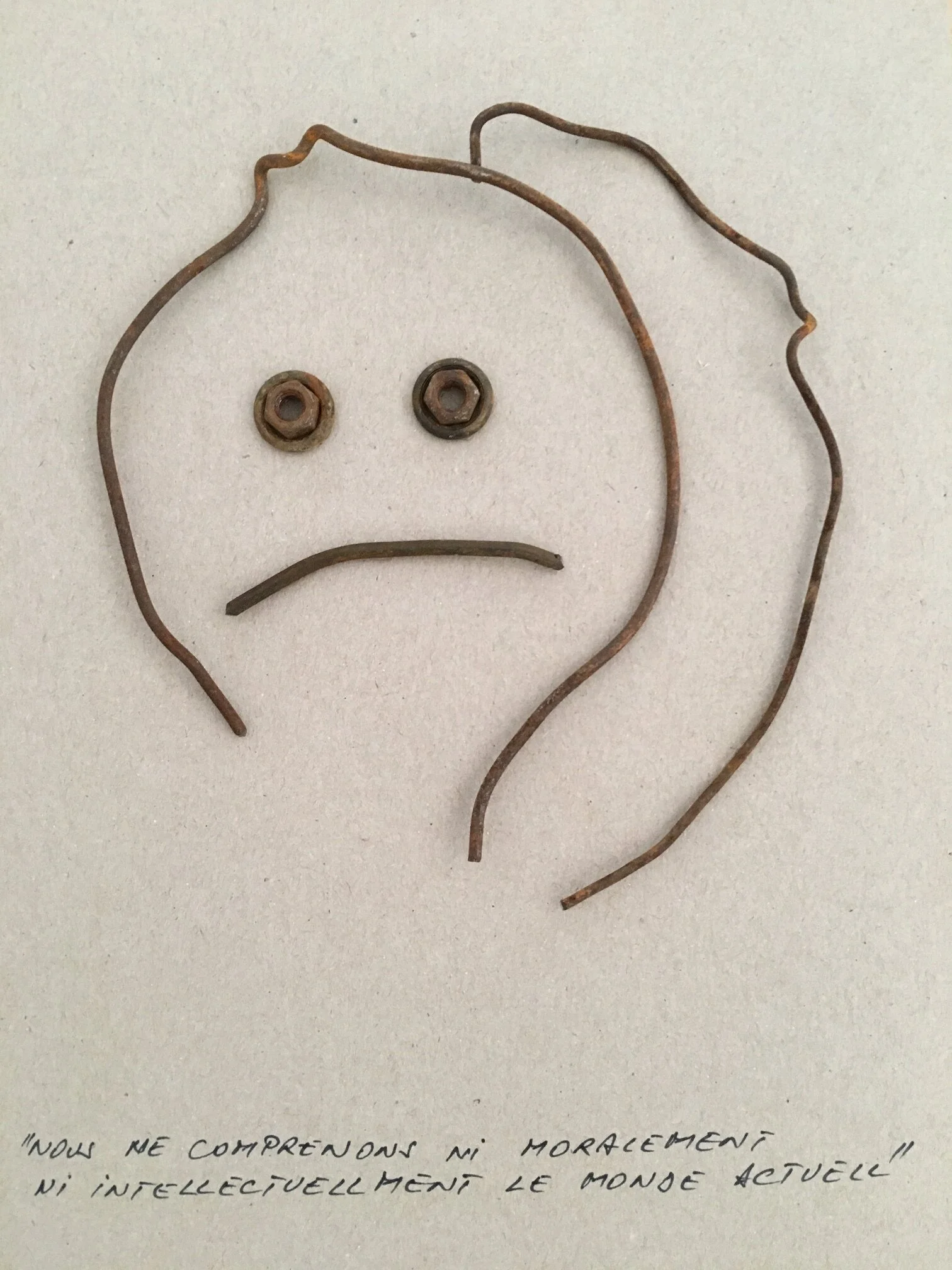“Trash Treasures” is my prolific series. It all started like child’s play and keeps going, no stop in sight. I used to jog near the building site of the swimming pool in our village. Each time I would pass by, I saw rusty wires and nails in the dirt and thought how much fun it would be to use them in pictures. One day, I collected and stuck them on recycled cardboard. A whole series of lively and expressive characters came into being. Later on, even funnier titles came to my mind. Through a favorable combination of circumstances, I was invited to show my pictures at the inauguration of the swimming pool. Within hours I sold half of the collection. My very first exhibition was an unexpected success.